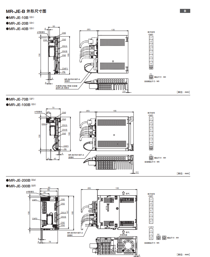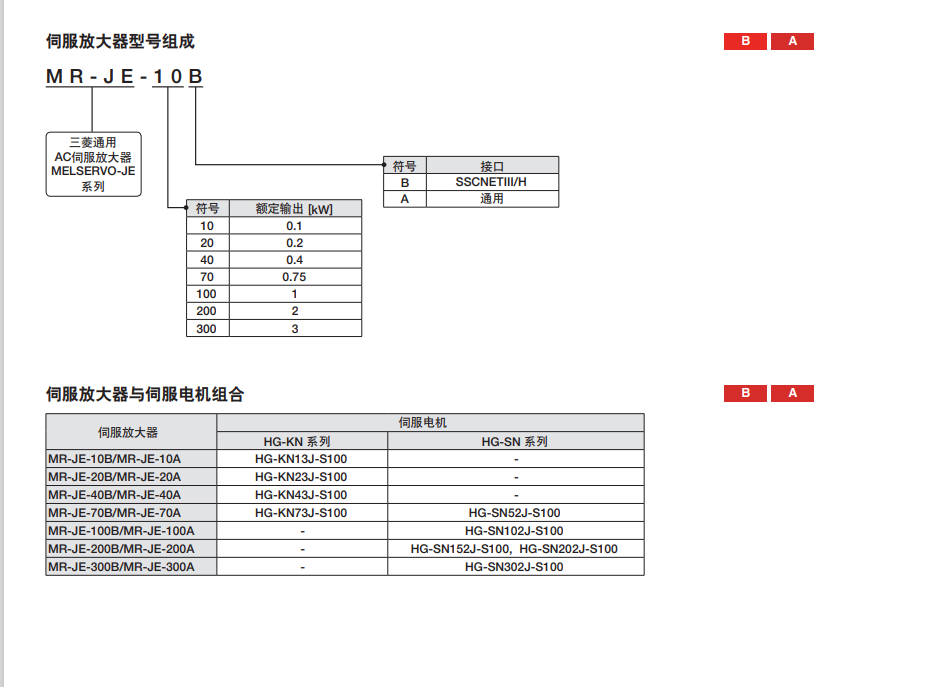 | 伺服放大器型號MR-JE- | 10B | 20B | 40B | 70B | 100B | 200B | 300B | |