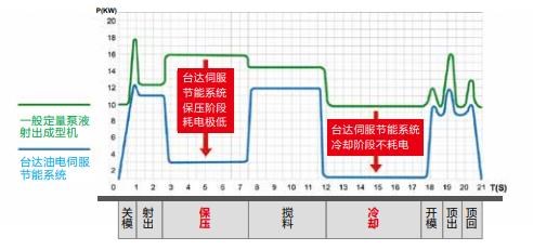 臺達油電伺服節能系統,控制每個過程所需的壓力與流量,消除節流的能源損耗,達到節能省電、提升成型品、提升競爭力、增加產能,一舉數得。