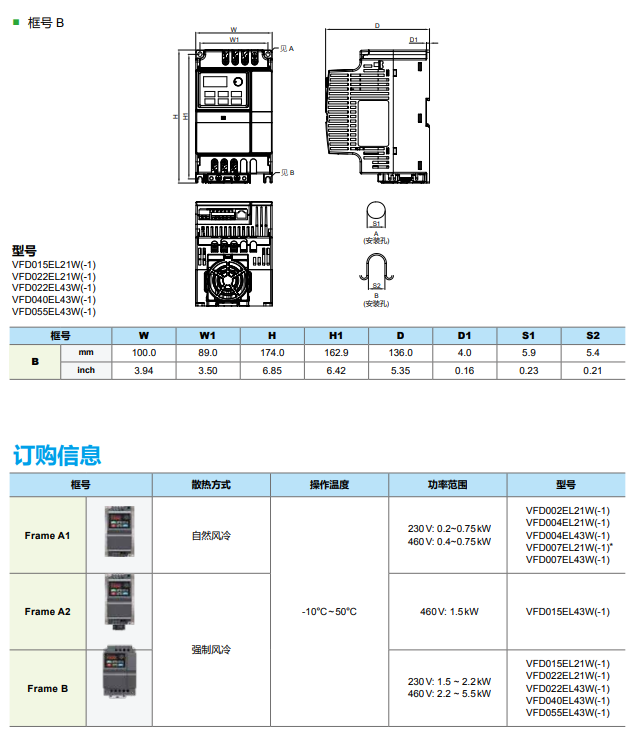 框號 A1: VFD002EL21W(-1) 230 V: 0.2~0.75 kW