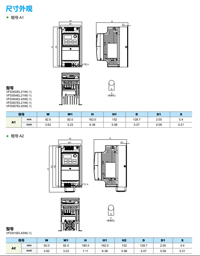 框號 A2: VFD015EL43W(-1) 460 V: 1.5 Kw 強制風冷
