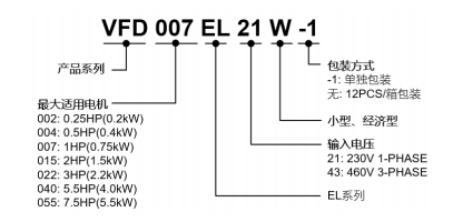 型號 VFD-__EL21W(-1) 002 004 007 015 022 004 007 015 022 040 055