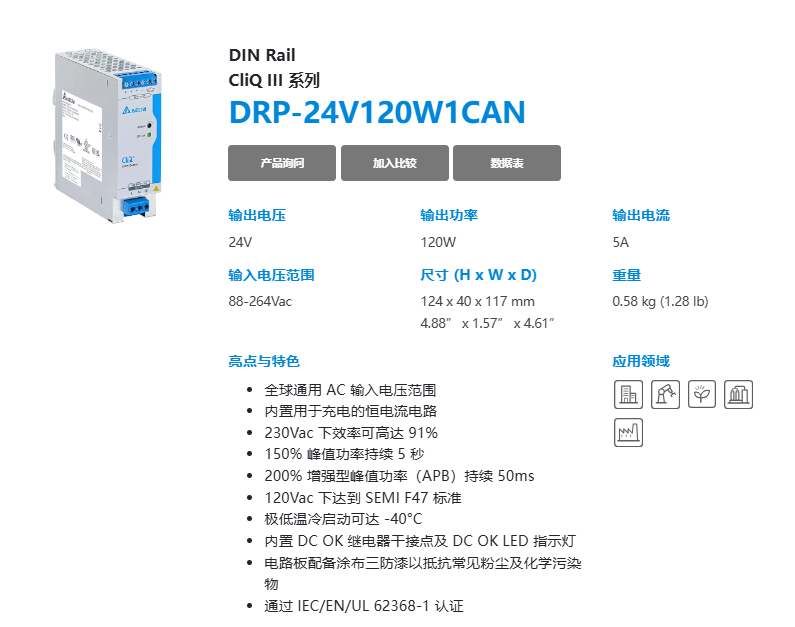 | 輸入電壓范圍 | DRP-24V□W1CAN: 88-264 VAC DRP-24V□W1CBN: 88-264 VAC (直流輸入范圍 88-375 VDC) 1 |