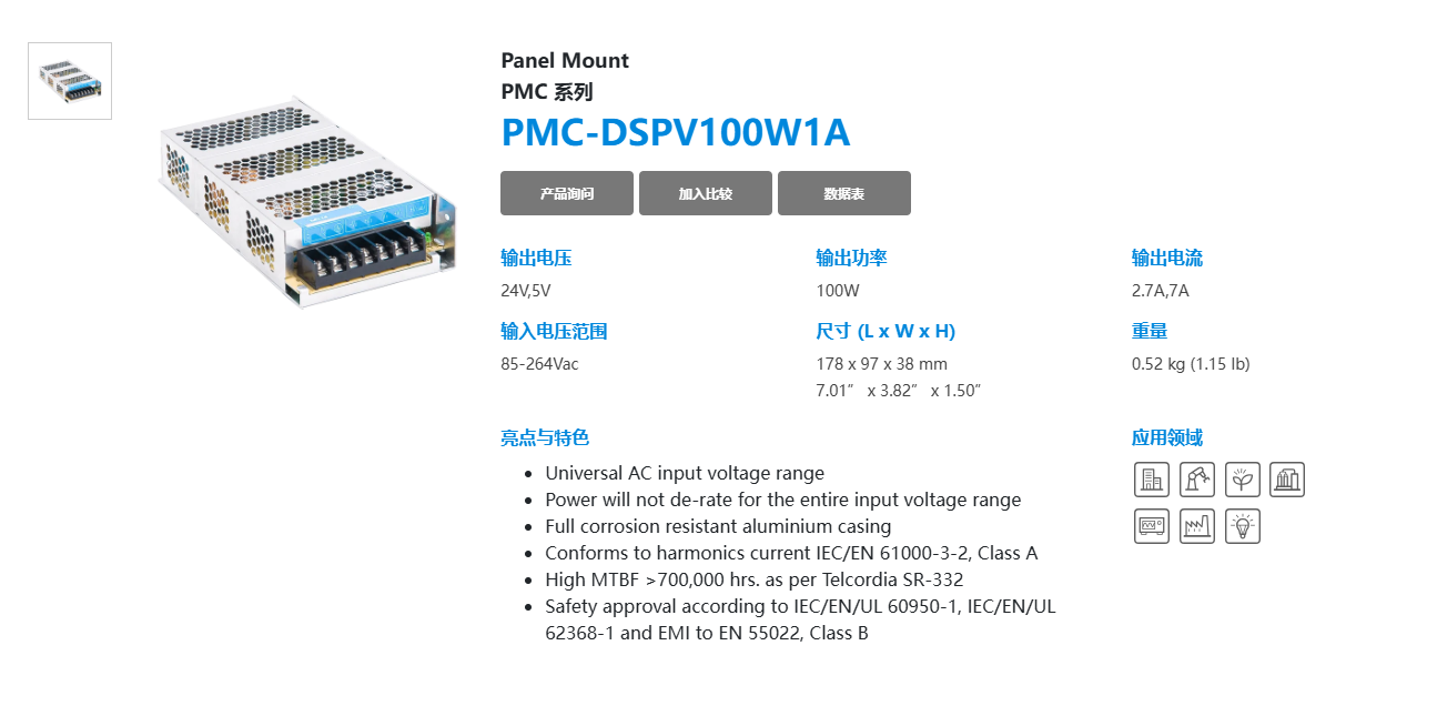 功率因素 115VAC 符合 EN 61000-3-2 > 0.99 > 0.98