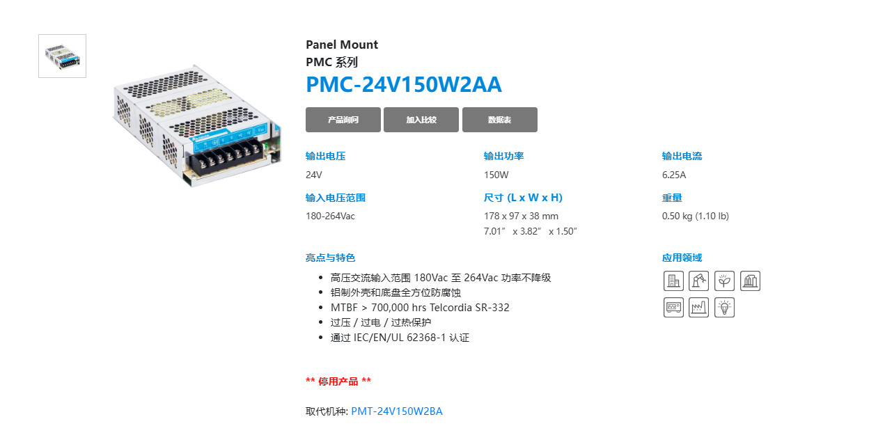• 高壓交流輸入范圍 180Vac 至 264Vac 功率不降級