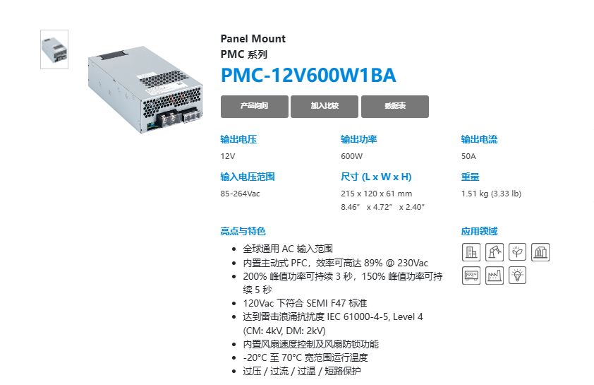 | 輸出 | PMC-05V015W1AA | PMC-12V150W1B | PMC-12V600W1BA | |