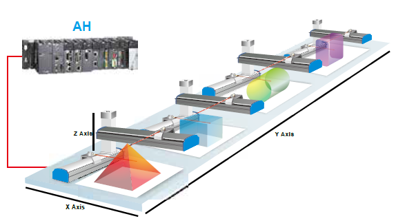 - AH500的運動控制功能,可實現任意三軸直線插補、任意兩軸圓弧插補、及任意三軸螺旋插補與連續插補功能,透過臺達DMCNET高速通訊網絡架構,更可達到1ms的指令周期內12軸同動或4組3軸同動插補功能。無論是復雜的過程控制或是精 密的運動控制需求,都能透過AH500來實現,有效應用于各種產業機臺,如建材機,經編機,食品包裝機等等。